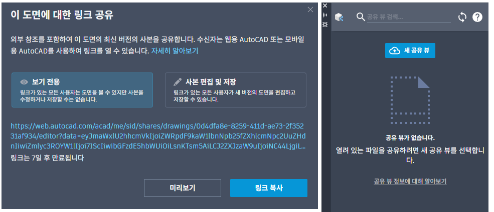 Autodesk Viewer 로 열리게 되는 공유 뷰와는 다르게 도면 공유는 AutoCAD Web 버전 혹은 Mobile App 을 통해 확인 할 수 있습니다. 따라서 도면 공유를 받게 되는 사용자는 계정만 존재해도 볼 수 있는 공유 뷰와 다르게 AutoCAD Web 에 대한 라이센스가 있어야 합니다. 왼쪽 이미지는 도면 공유의 방법으로 파일을 보기 전용, 편집 할 수 있도록 만드는 옵션이 존재하며 링크는 7일 간 유효합니다. 오른쪽 이미지는 공유 뷰의 방법으로 오로지 보기만 할 수 있으며 주석을 추가하면 공유 뷰 탭으로 업데이트되어 공동작업할 수 있습니다. 해당 파일은 30일간 보존된 후 자동 삭제 됩니다.