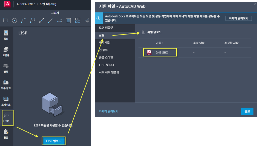 2. AutoCAD Web (공유 받는 사용자) 에서 아래와 같이 누락된 폰트를 업로드 합니다.