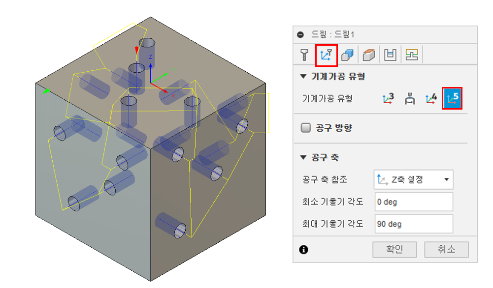 - 공구 자세 결정: CAM 시스템은 최적의 가공을 위해 공구 홀더와 공작물 간의 간섭을 피하면서, 공구가 각 홀의 중심 축에 수직으로 접근할 수 있도록 5축 회전 각도를 계산합니다.