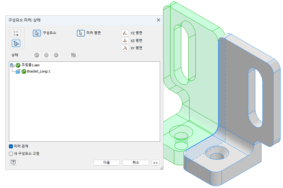 먼저 조립품에서 구성요소를 미러 하여 파일을 저장합니다.