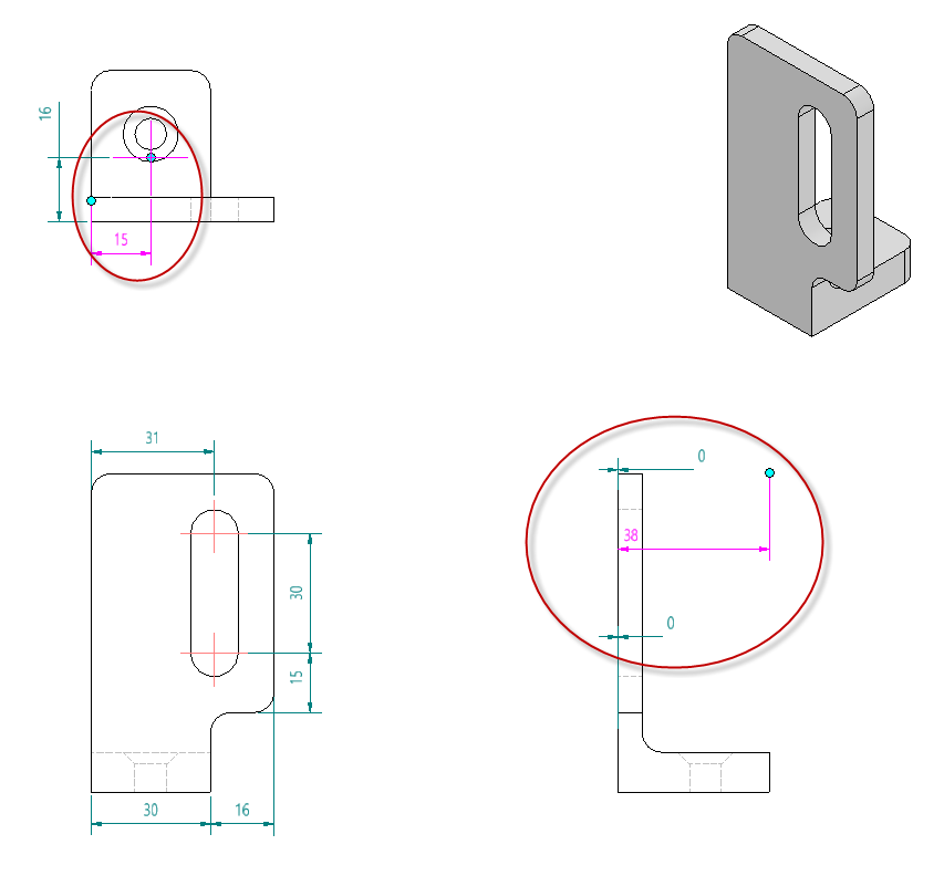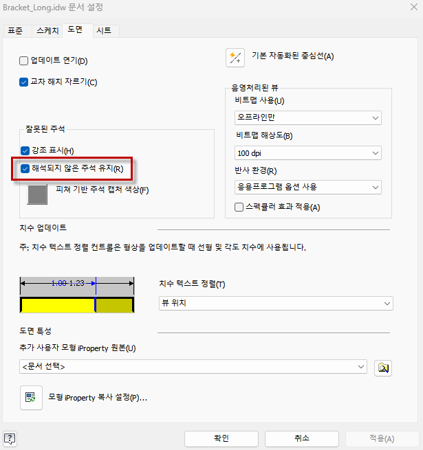 도구 > 문서> 도면 탭에서 “해석되지 않은 주석 유지” 를 체크합니다. 이 옵션을 체크하면 참조가 끊긴 치수가 완전히 사라지지 않고 다시 연결할 수 있도록 색상으로 구분되어 표시됩니다. 미러된 구성요소를 가져오는 과정에서 본도 형상의 모서리나 면이 사라지면 치수가 사라질 수 있습니다. 작업 피쳐(작업평면, 축 등)에 치수를 기입하면 모델 형상 변경에 유리하게 활용할 수 있습니다.