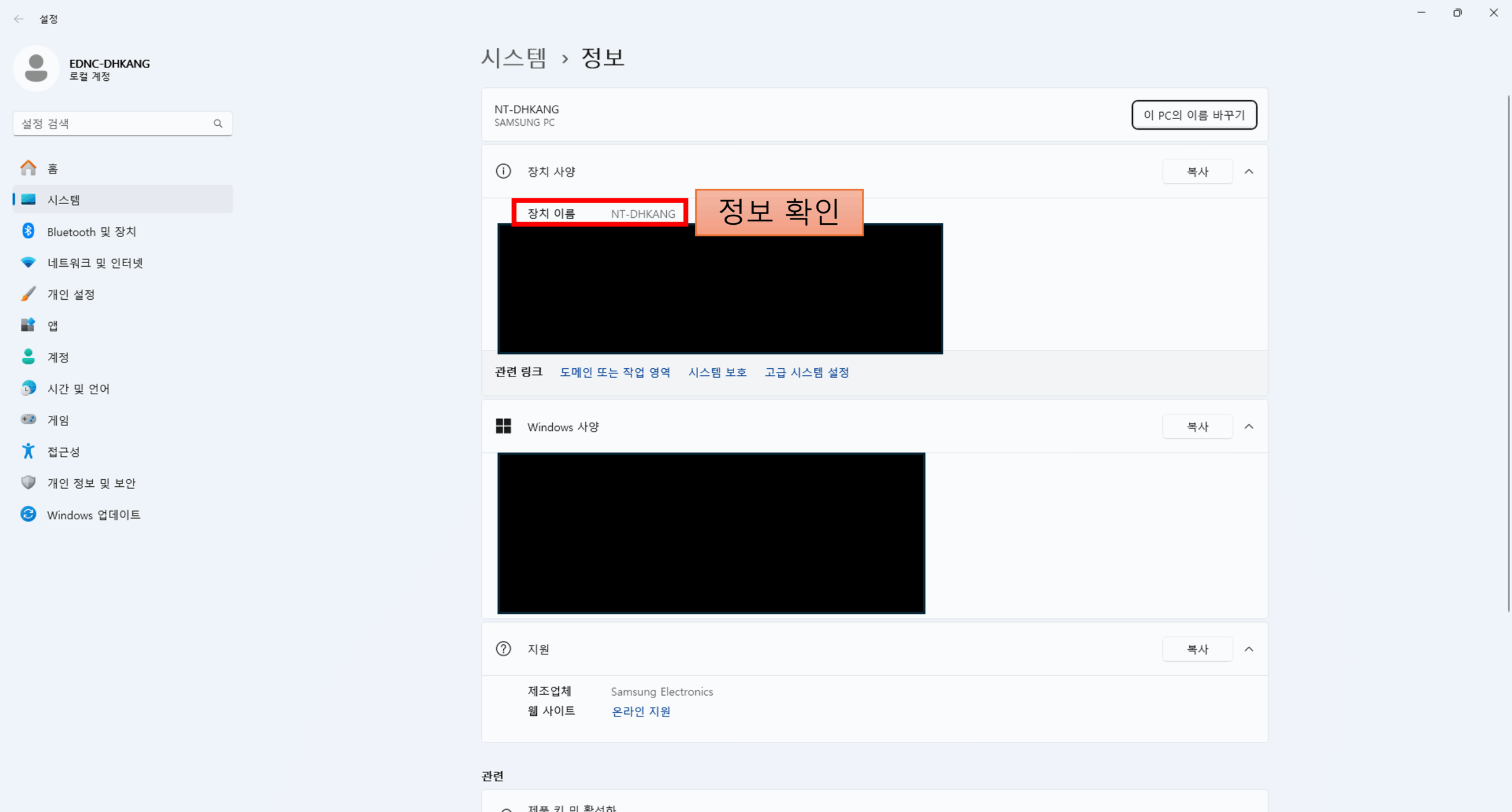 2. [설정]창에서 [장치 이름]을 확인합니다.