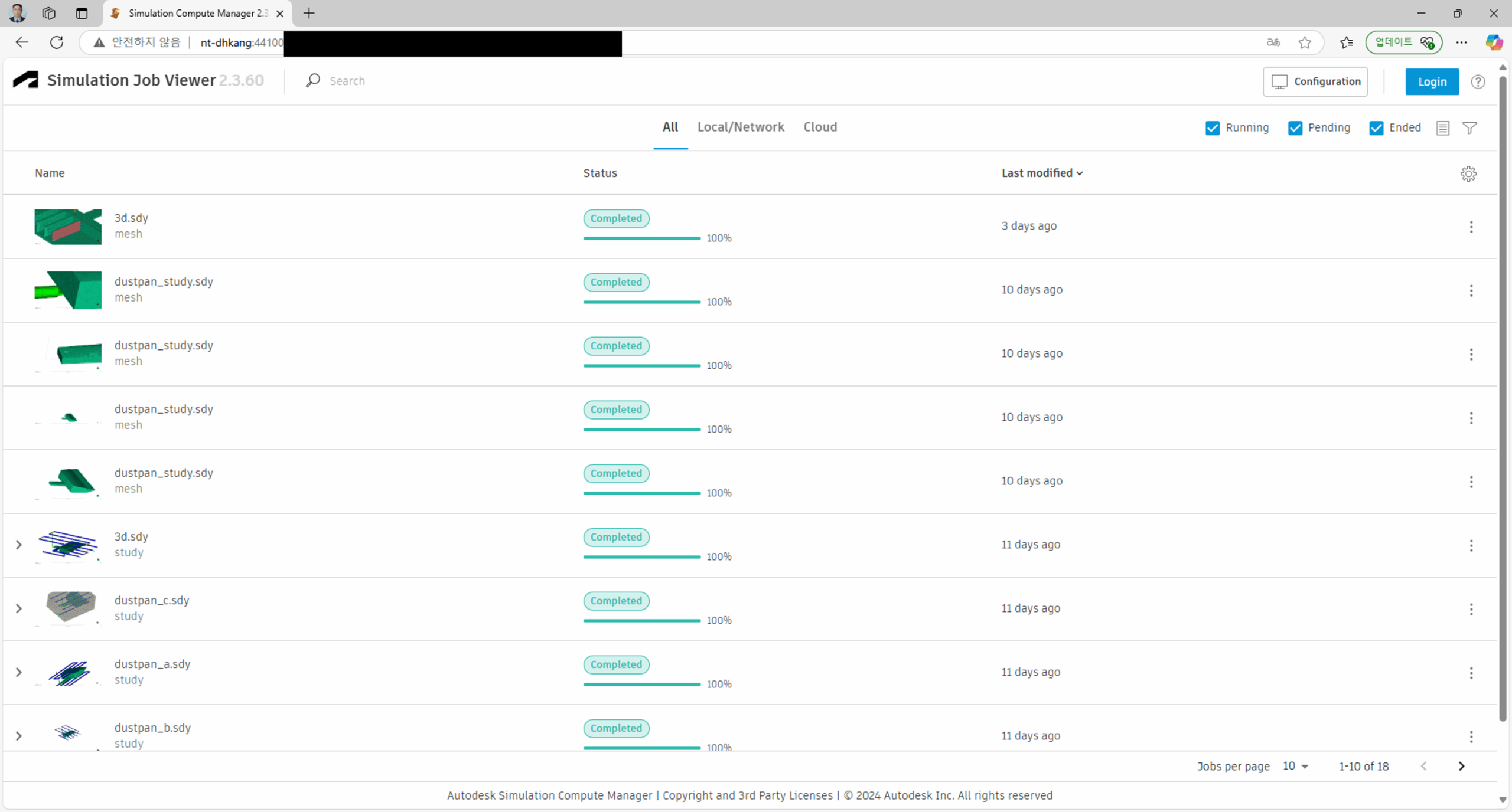 Moldflow에서 해석을 실행하면 로그(Log)창에서는 정상적으로 해석이 진행되는 것처럼 보이지만, 잡 매니저(Job Manger)를 실행했을 때는 연결되지 않는 현상이 발생할 수 있습니다. 이러한 경우, 잡 매니저 주소창 앞부분에 표시된 PC 이름과 현재 사용중인 내 컴퓨터의 이름이 일치하는지 확인하셔야 합니다. 만약, 두 이름이 동일하지 않다면, PC의 이름으로 수정하시면 정상적으로 연결됩니다. 매번 수정하기 번거로우시다면, [Add another computer]에서 내 PC를 등록해 주시면 됩니다.