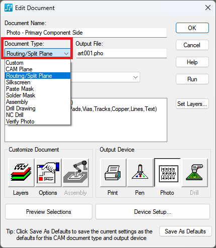 Plane thermals 및 핀이 CAM 미리 보기에서 negative image처럼 보이는 문제는 일반적으로 레이아웃 레이어 정의를 변경했지만, 그에 맞춰 CAM 문서 유형을 업데이트하지 않아 발생합니다.