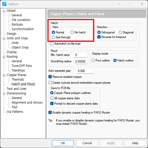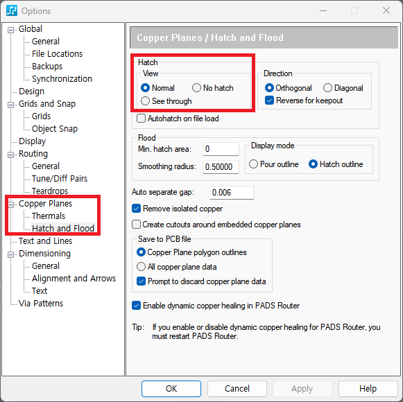2. Options 창에서 Copper Planes > Hatch and Flood 카테고리를 선택합니다.