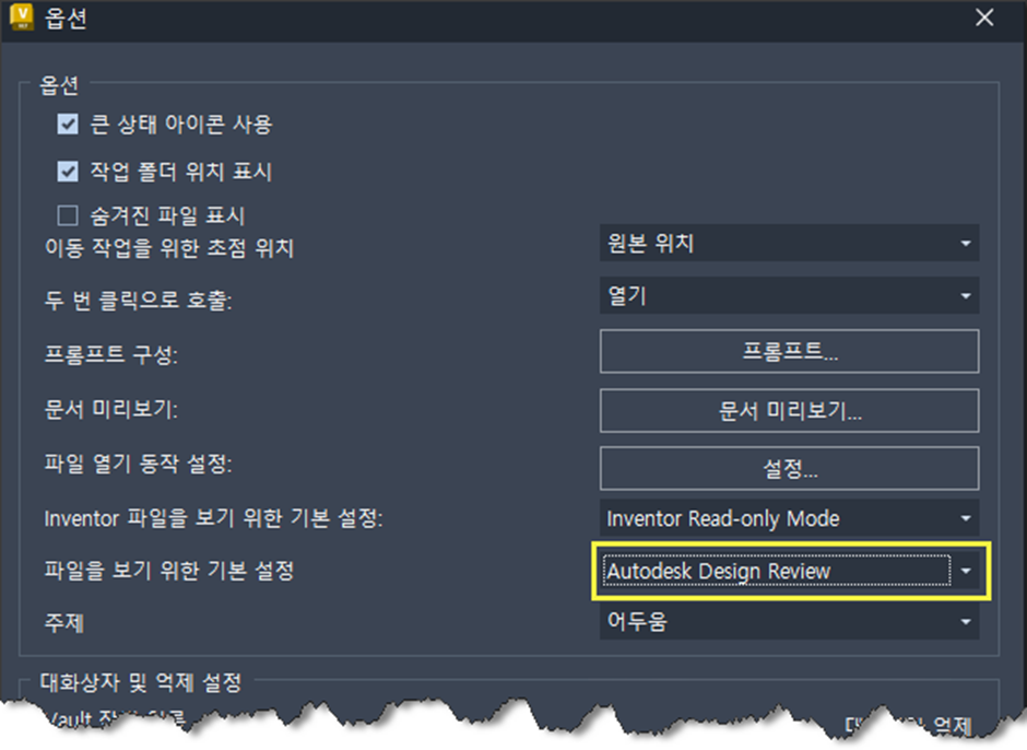 Vault에서 미리보기를 보는 설정은 두 가지 입니다. 하나는 최근 몇년간 주로 사용하고 있는 Autodesk 뷰어와 오래된 방식의 Autodesk Design Review 입니다. Vault 옵션에서 “파일을 보기 위한 기본 설정”을 Autodesk Design Review 로 설정하여 뷰 업데이트 작업할 경우 아래와 같은 증상이나 상황들이 있을 수 있습니다. 사용자들은 미리보기의 상황에 맞게 대처할 수 있도록 작업해야 합니다.