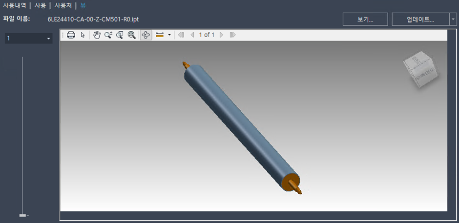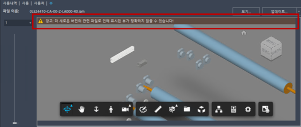 아래 처럼 미리보기 화면 상단에 경고 메시지가 나오는 경우에는 현재 보이는 미리보기가 최신 상태가 아니라는 뜻으로 해석됩니다. 예를 들면 조립품 파일을 공동 작업을 하던 과정에 하위 구성요소를 수정한 후 포함된 상위 조립품을 체크인하지 않을 경우에 보일 수 있습니다.