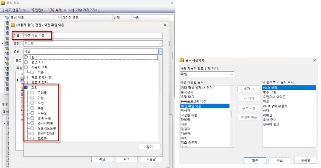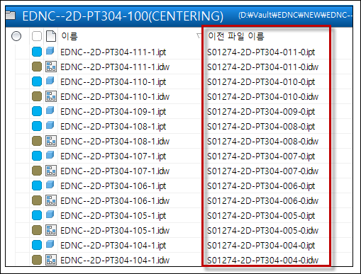 - Vault에서 제공하는 “파일 이름(이전)” 필드 값은 설계 복사시 최신의 파일이름이 쓰여지고 이름 바꾸기 진행 시 이전 버전을 표시됩니다.
