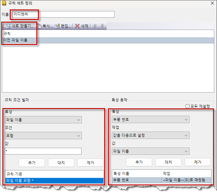 2. 기본적으로 도면 양식지의 도면번호(DWG NO)는 파일 이름을 따라가도록 만들기 위해 아래와 같이 규칙 조건 빌더와 특성 동작을 추가하여 만듭니다.