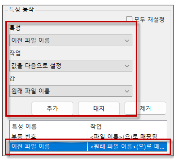 3. 특성 동작의 특성에서 사용자로 만들었던 필드의 “이전 파일 이름” 을 선택하고 아래와 같이 “추가” 합니다.
