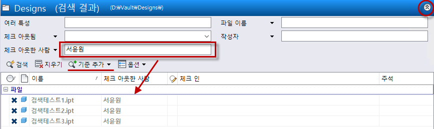3. 기준 추가 항목에서 “체크 아웃한 사람” 을 추가 하여 사용자를 검색합니다.