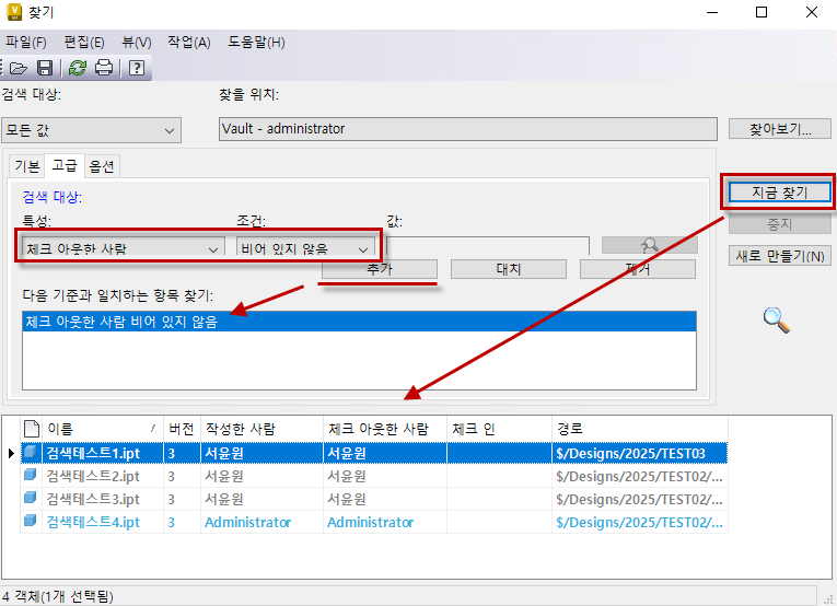 3. 찾기 화면에서 특성과 조건을 아래와 같이 선택 한 후 추가하여 “지금 찾기”로 검색하면 사용자와는 무관하여 체크아웃된 모든 파일이 검색됩니다.