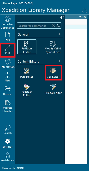 2-1. Library Manager에서 상단 메뉴 또는 Global Command Bar를 통해 Edit > Content Editors > Cell Editor를 선택하여 Cell Editor를 실행합니다.