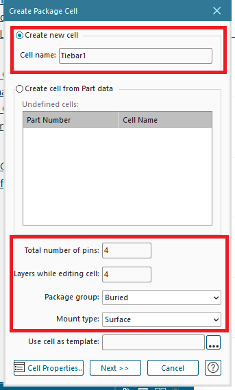 2-3. Package 탭에서 New Cell 버튼을 클릭하여 새로운 Package Cell을 생성 후 Create Package Cell 창에서 다음과 같이 설정합니다.