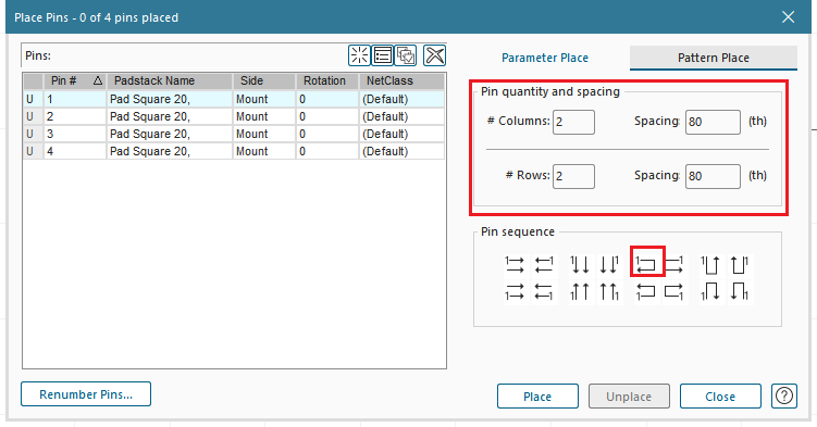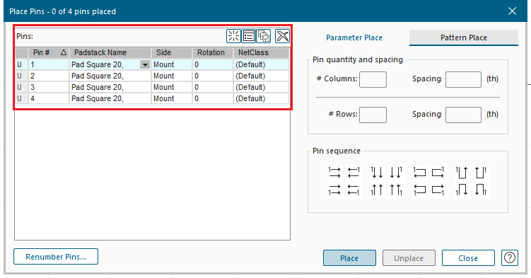 그 후 Pin Sequence를 설정한 후, 모든 핀을 선택하고 Place를 클릭합니다.