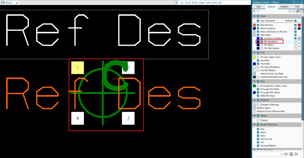 Objects > Part Items > Pin Numbers를 활성화하여 핀 번호를 표시합니다.
