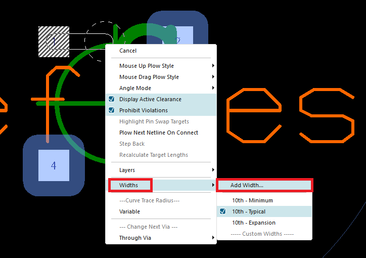 2-9. Pin P1을 선택한 후, Route > Add Routes > Plow 또는 단축키 Ctrl + Q를 사용하여 라우팅을 시작합니다. 이후 P1 위에서 우클릭(RMB)하여 Width를 20 th로 설정합니다.