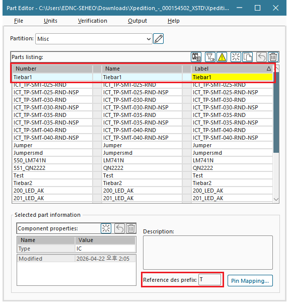 3-3. Part Number, Part Name, Part Label을 모두 Tiebar1로 입력하고, Reference Prefix를 T로 변경합니다.