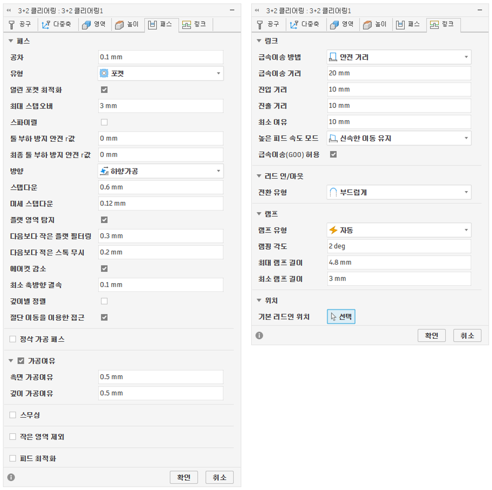 - 최적화: 링크 탭의 ‘급속이송 허용’ 설정을 통해 안전을 확보하면서도 비절삭 이동 시간을 최소화합니다.