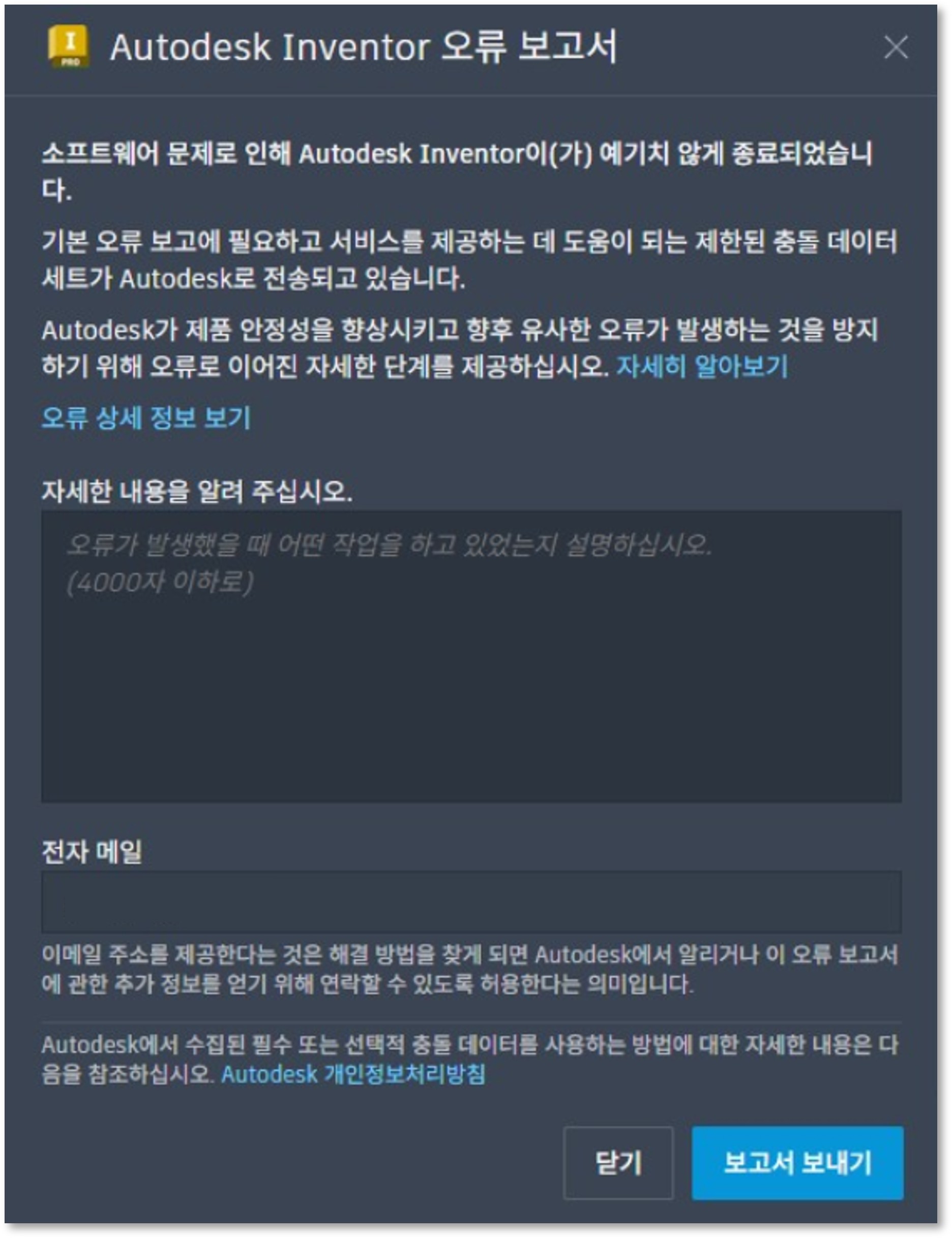 Inventor 사용 중 렌더링 작업을 실행하면 오류 보고서 제출 창이 표시된 후 프로그램이 강제 종료되는 현상이 반복적으로 발생하였습니다.
