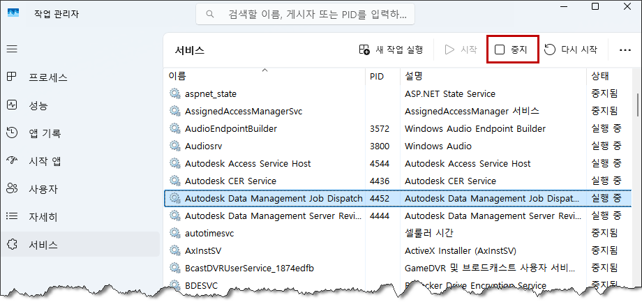 - 해결 방법 1 : 작업 관리자에서 해당 항목을 중지 한 후 재시도를 진행 합니다.