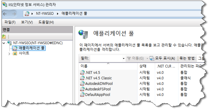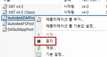 - 해결 방법 2 : IIS(인터넷 정보 서비스) 관리자에서 AutodeskDMPool 항목을 중지 한 후 재시도 합니다.