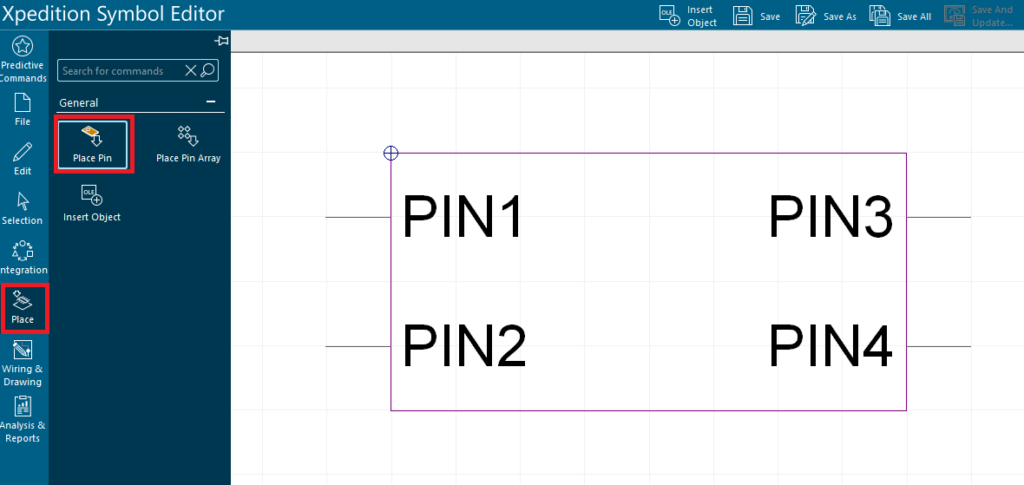 4. Place > Add Pins를 선택하거나, 상단 메뉴의 Add Pin 버튼을 클릭하여 핀 4개를 배치합니다.