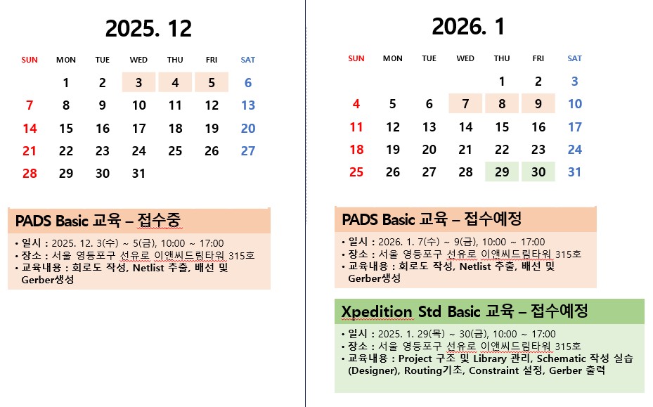 ED&C에서는 PADS Designer, PADS Router 등 다양한 제품의 교육이 진행되고 있습니다. 보다 자세한 내용은 ED&C 홈페이지(https://www.ednc.com/#c3)를 접속하여 확인 가능합니다.